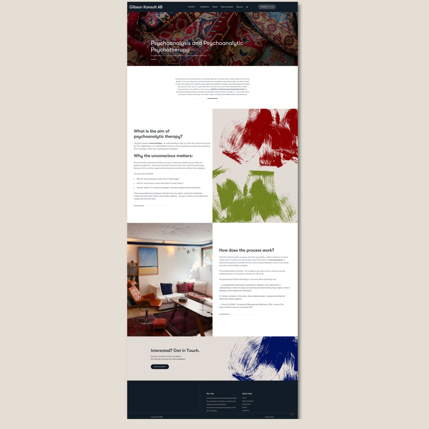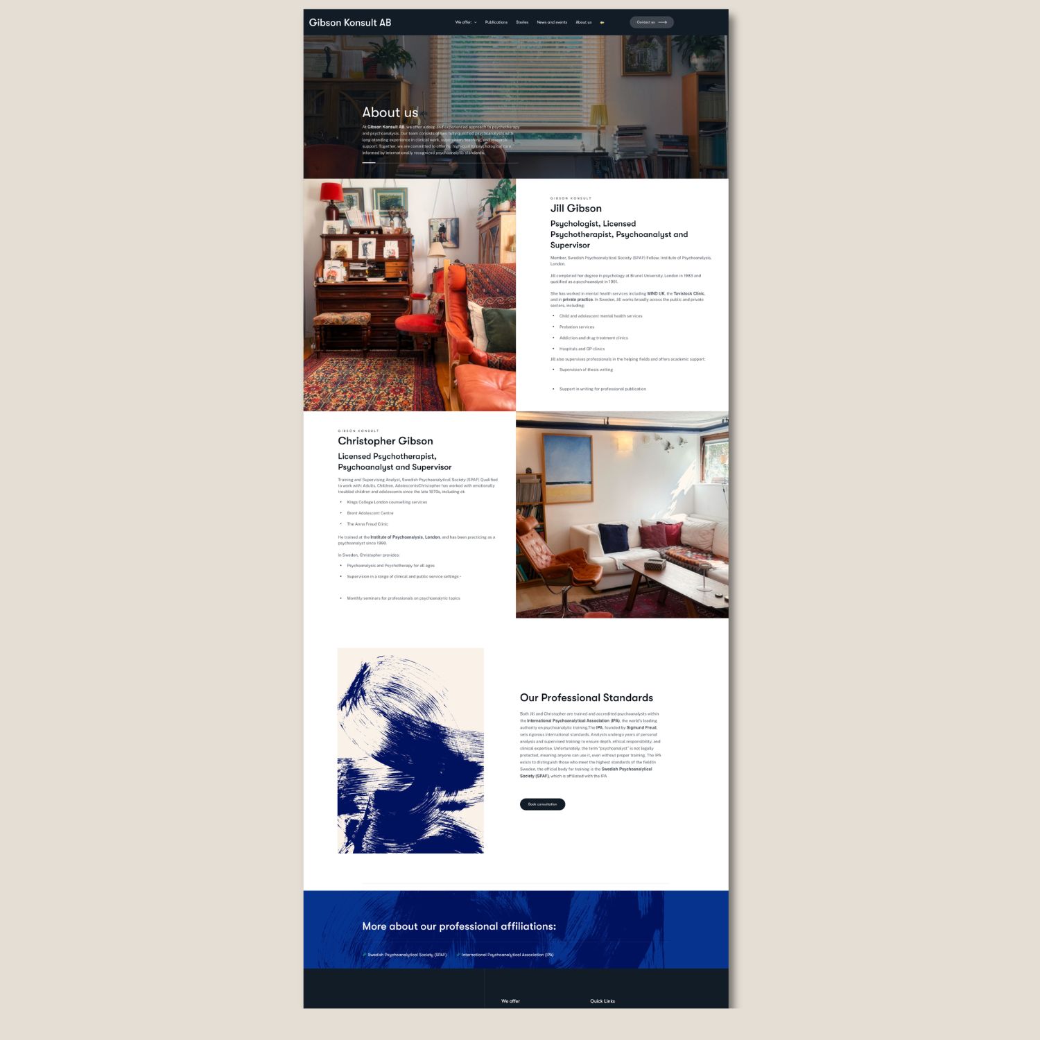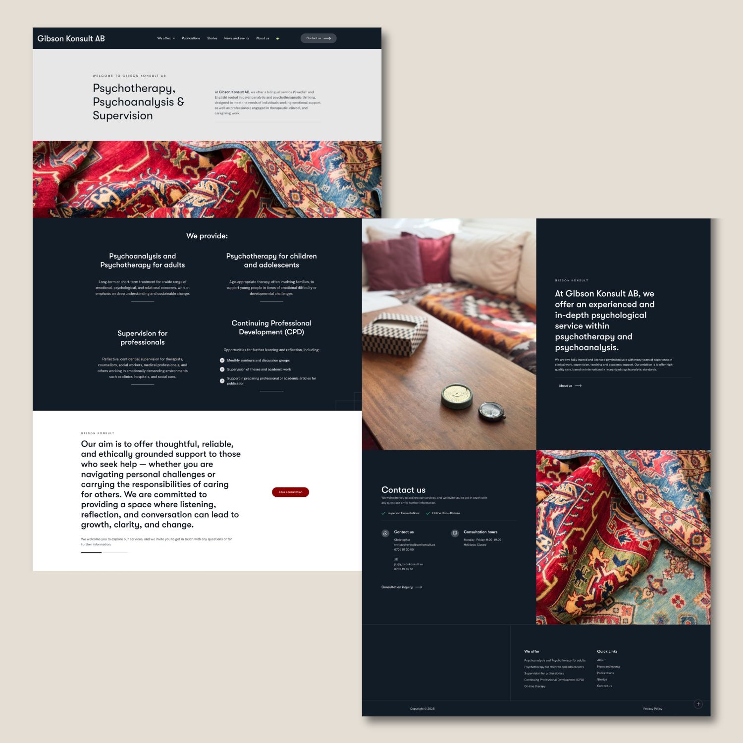 The new website presents a coherent and trustworthy image of Gibson Konsult’s expertise and values. Visitors can easily understand the services, book online therapy, and access publications and events. The bilingual solution has increased accessibility for international clients, while the visual expression and imagery create a stronger emotional connection.